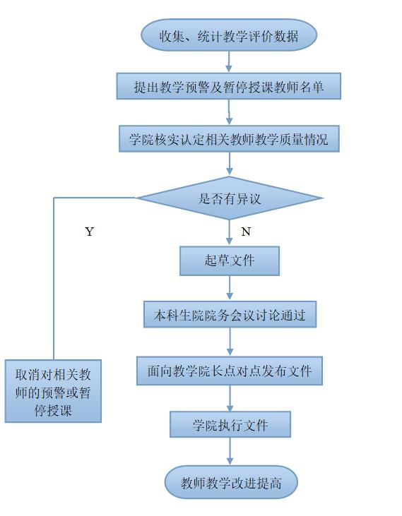 权力运行内部流程 | 运行环节 | 对历年学生评教等情况进行统计—提出教学预警、暂停及退出相关课程授课资格的教师名单-—组织各学院对相关情况进行核实认定—起草文件—本科生院院务会议讨论通过—面向学院(部)教学负责人点对点发布预警、暂停及退出授课资格教师名单 |